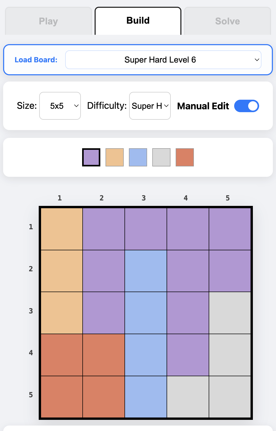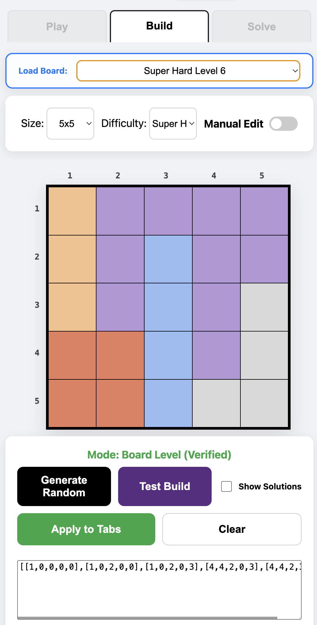 The Build tab allows you to load pre-made boards, generate random puzzles, or architect your own.